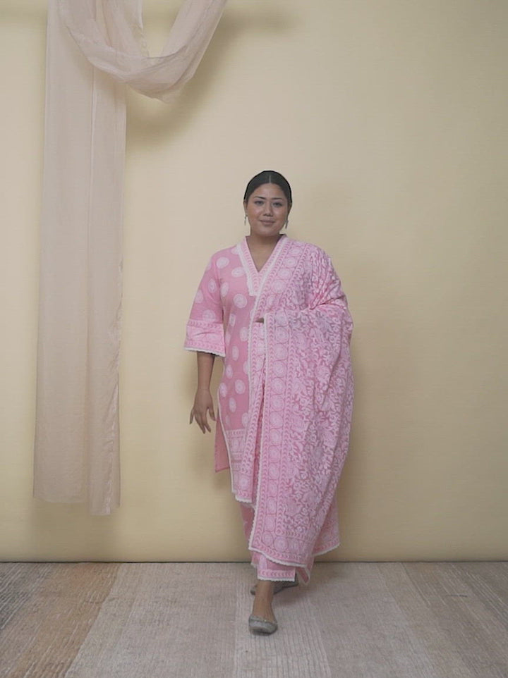 This 3-piece suit set includes our pink Khari print V neck kurta, matching palazzo pants and printed dupatta. Crafted in cotton for simple comfort. Perfect for outdoor brunches.