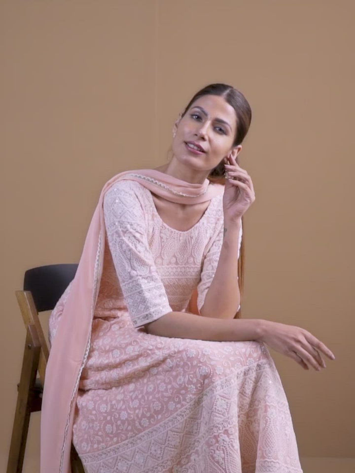 Pink Embroidered Georgette Anarkali Kurta With Palazzos & Dupatta