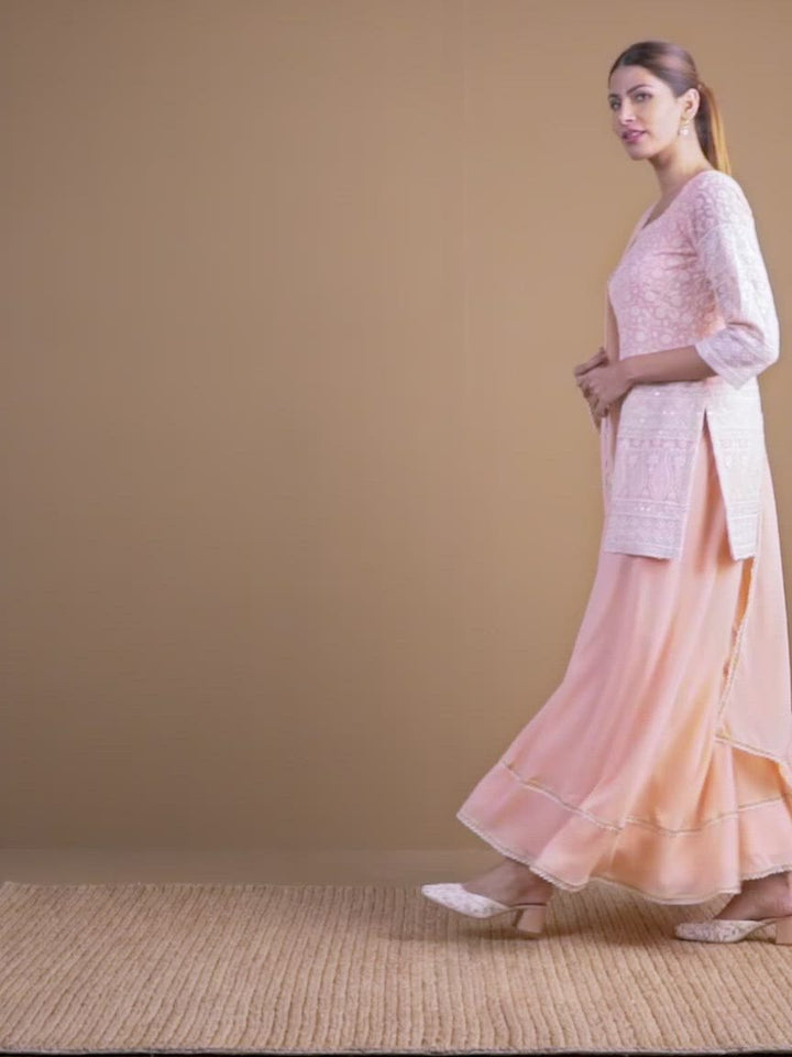 This 3-piece suit set includes our pastel pink round neck short kurta, flared palazzo pants and a matching dupatta. Embroidered in a combination of floral and geometric motifs and delicate lace details. Perfect for evening festivities.
