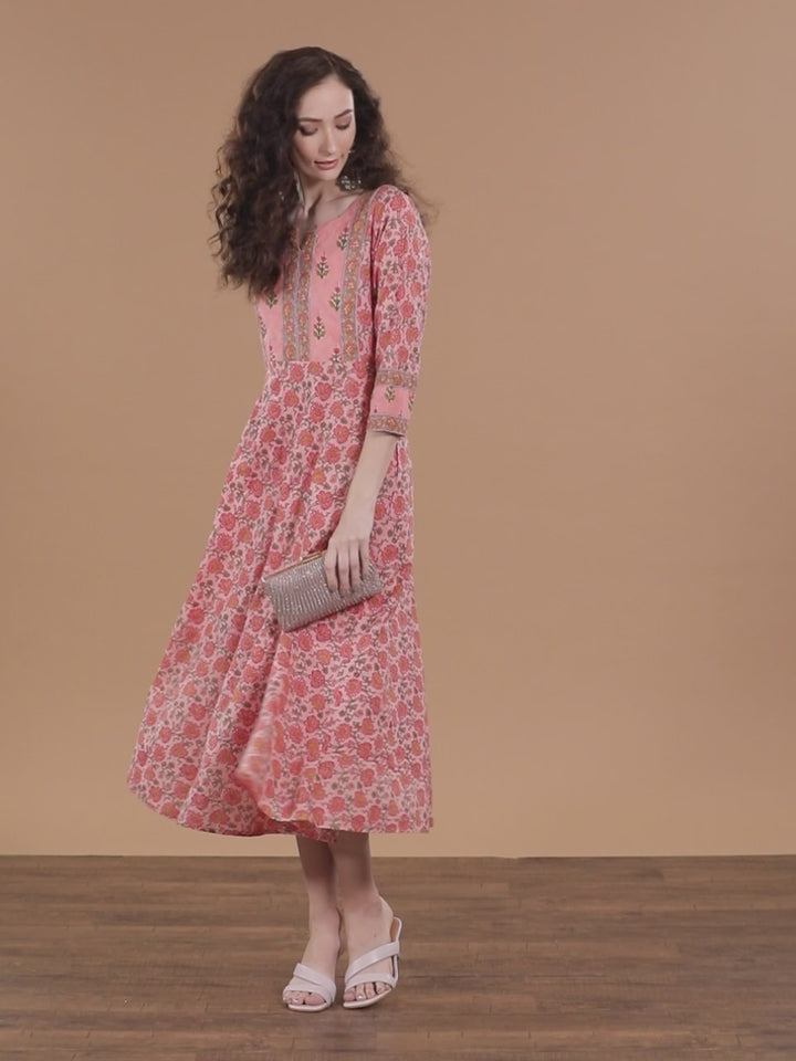 Our pink and green printed cotton A-line maxi dress, elevated with a notched neckline, three-quarter sleeves, and a flared hemline, is perfect for daytime festivities.