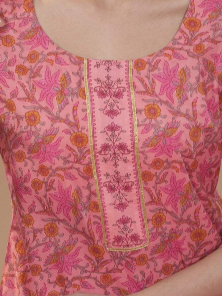 Our pink straight-fit cotton kurta features a floral print, a round neckline, three-quarter sleeves, and Gota Patti details. This elegant style is perfect for work and beyond.