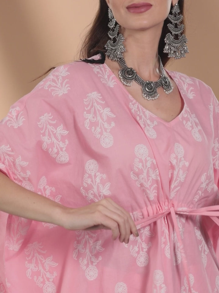 Our 2-piece pink cotton loungewear set features a floral print kaftan kurta with a V-neckline and three-quarter sleeves. Complemented with a straight slip-on pyjama pants with roomy pockets. Ideal for lounging-in or running errands.