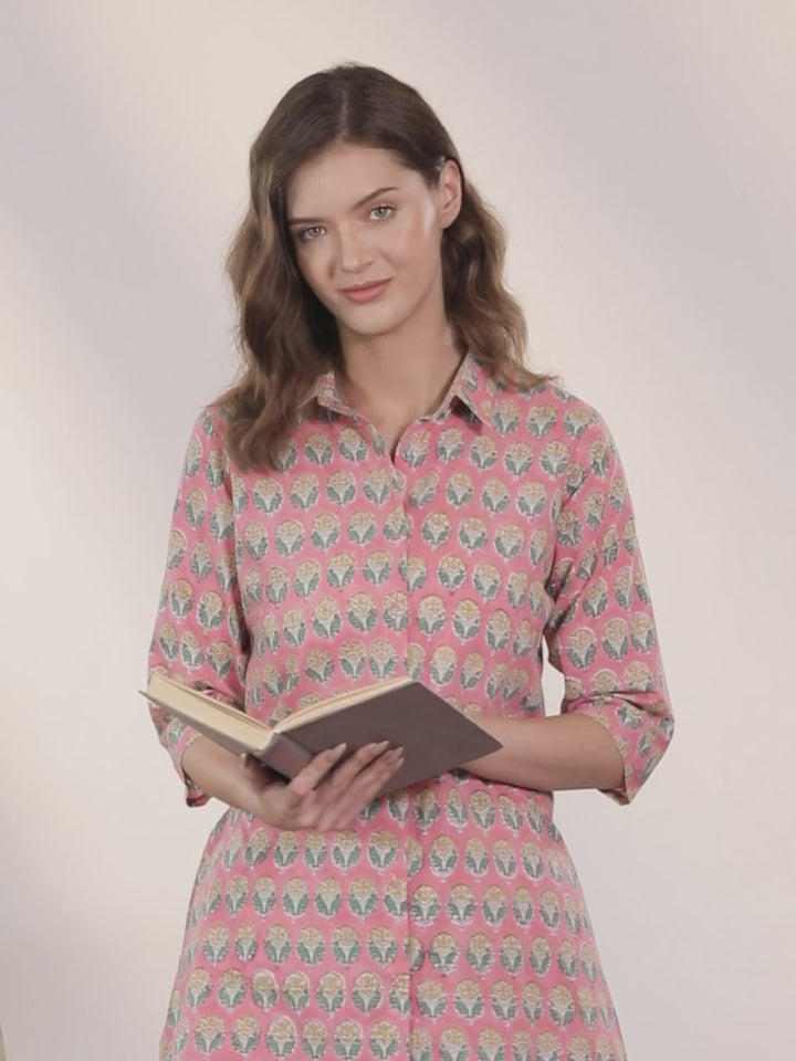 Our 2-piece pink cotton pyjama set features a floral print kurti with a shirt collar and three-quarter sleeves. Complemented with straight slip-on pyjama pants with roomy pockets. Ideal for lounging or casual outings.
