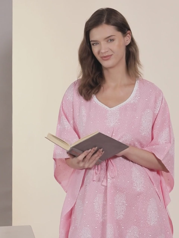 Our pink printed cotton night dress features a V-neckline, and a dori along the waistline and kaftan sleeves. Adorned with lace-trim accents, this outfit is ideal for lounging in as well as running errands.