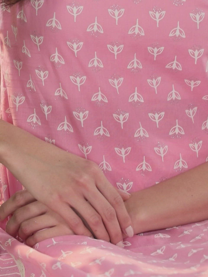 Pink Printed Cotton Straight Kurta With Palazzos & Dupatta