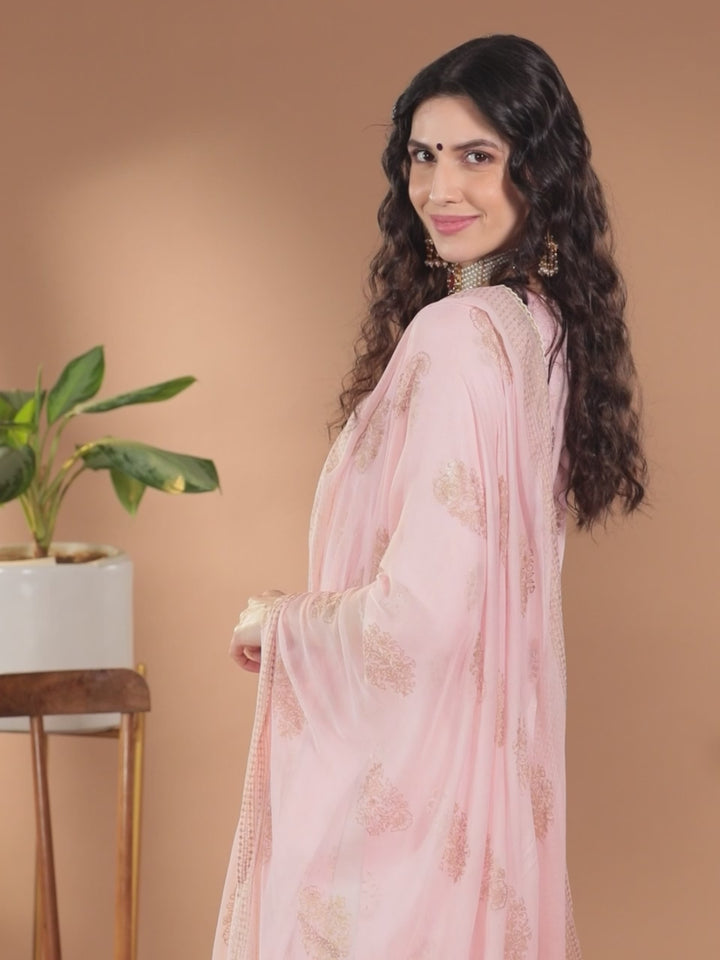 Our 3-piece silk blend pink suit set features a printed kurta with notched neckline, and regular three-quarter sleeves. Complemented with straight hem palazzos with two roomy pockets and a matching dupatta, this style is perfect for light festivities.