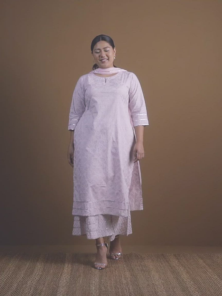 This 3-piece suit set includes our pink round neck straight kurta, straight palazzo pants and a matching dupatta. Crafted in cotton, featuring white and grey hued motifs detailed with Gota-Patti trim details in a notched neckline. Perfect for casual brunches.