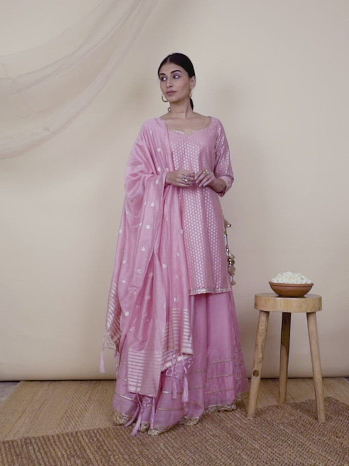 Pink Self Design Silk Straight Kurta With Skirt & Dupatta