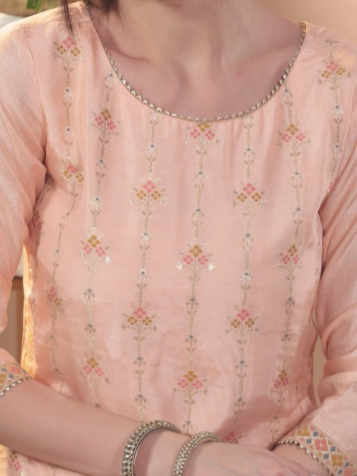 Our 3-piece pink woven silk suit set features a straight-fit kurta with a round neckline and three-quarter sleeves. Complemented with straight pants, and a matching dupatta. Adorned with fabric-trim detailing and Gota Patti accents, this refreshing style is perfect for festivities.