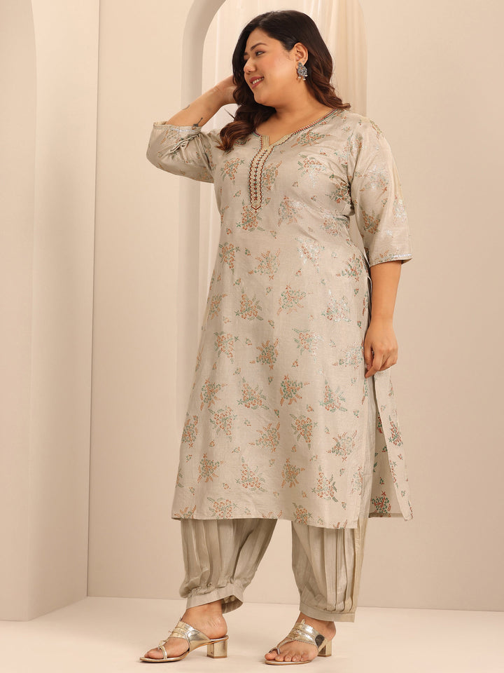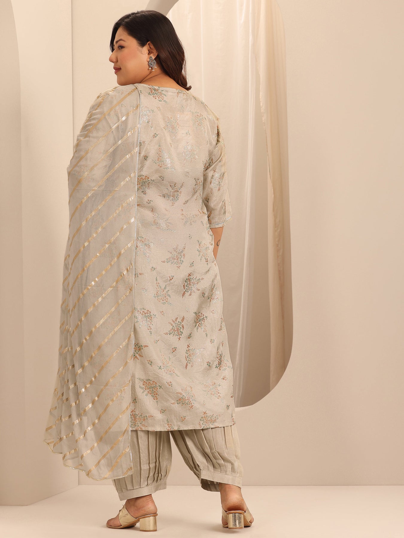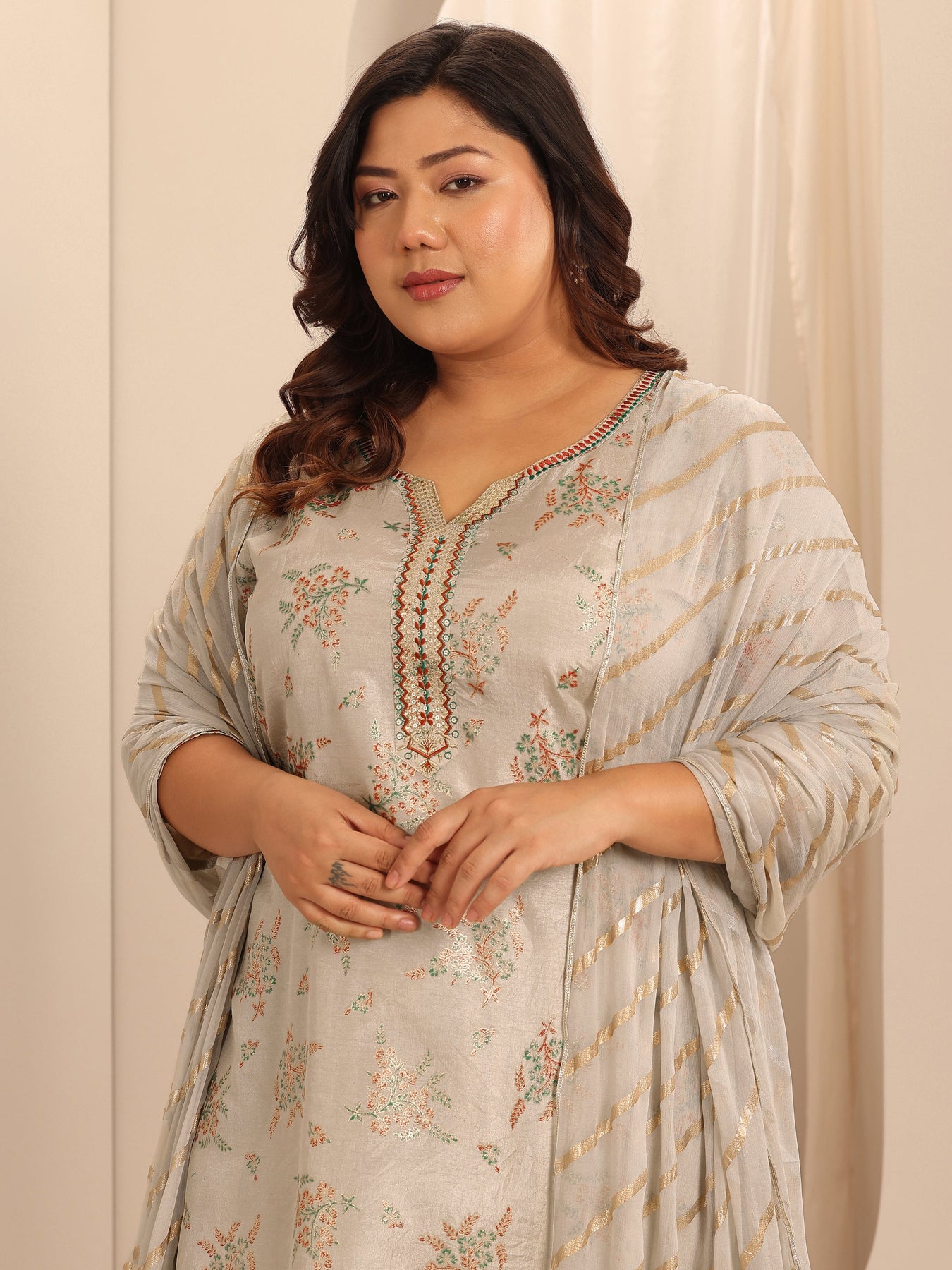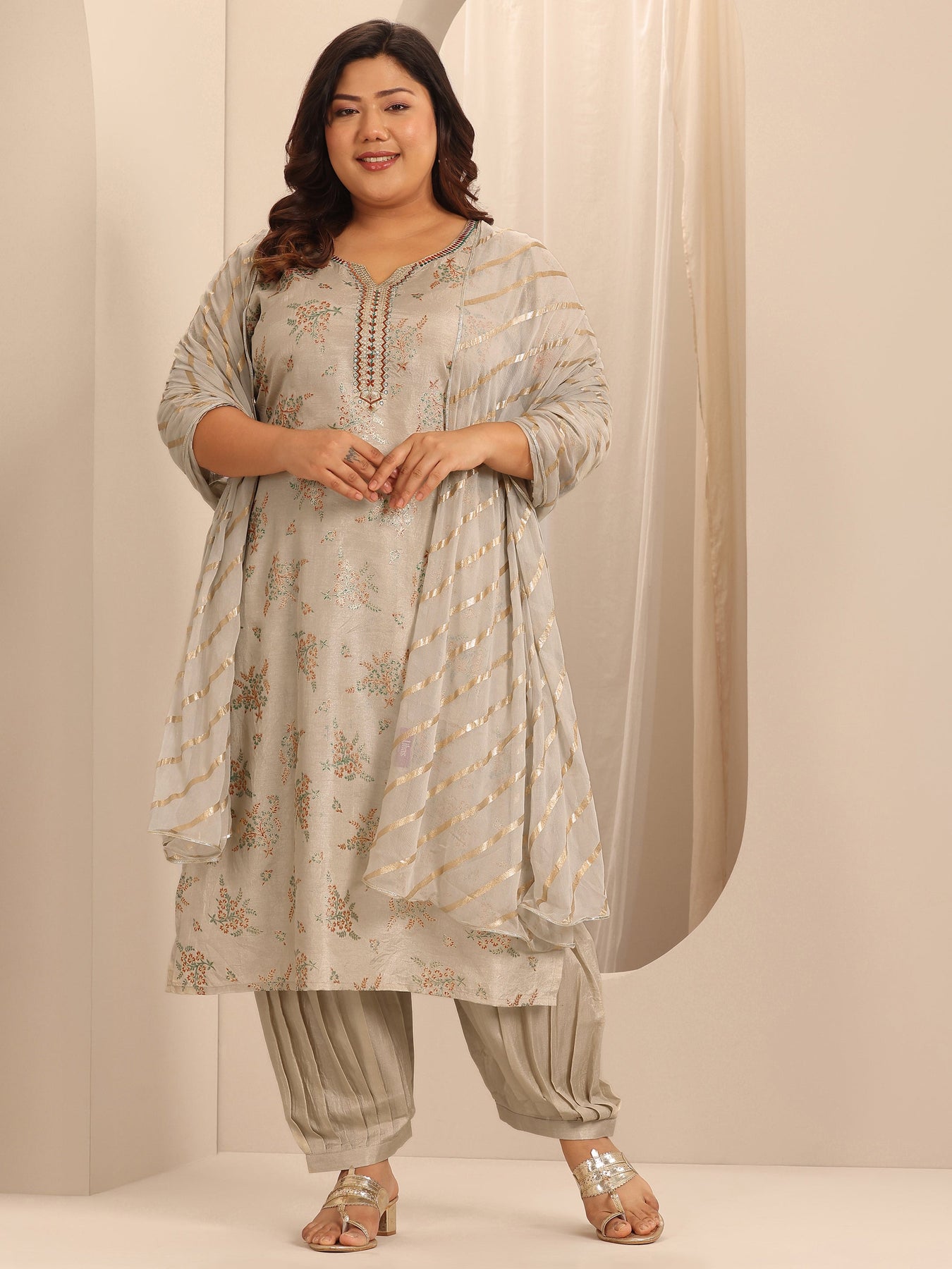 Plus Size Grey Printed Silk Blend Straight Suit Set With Dupatta