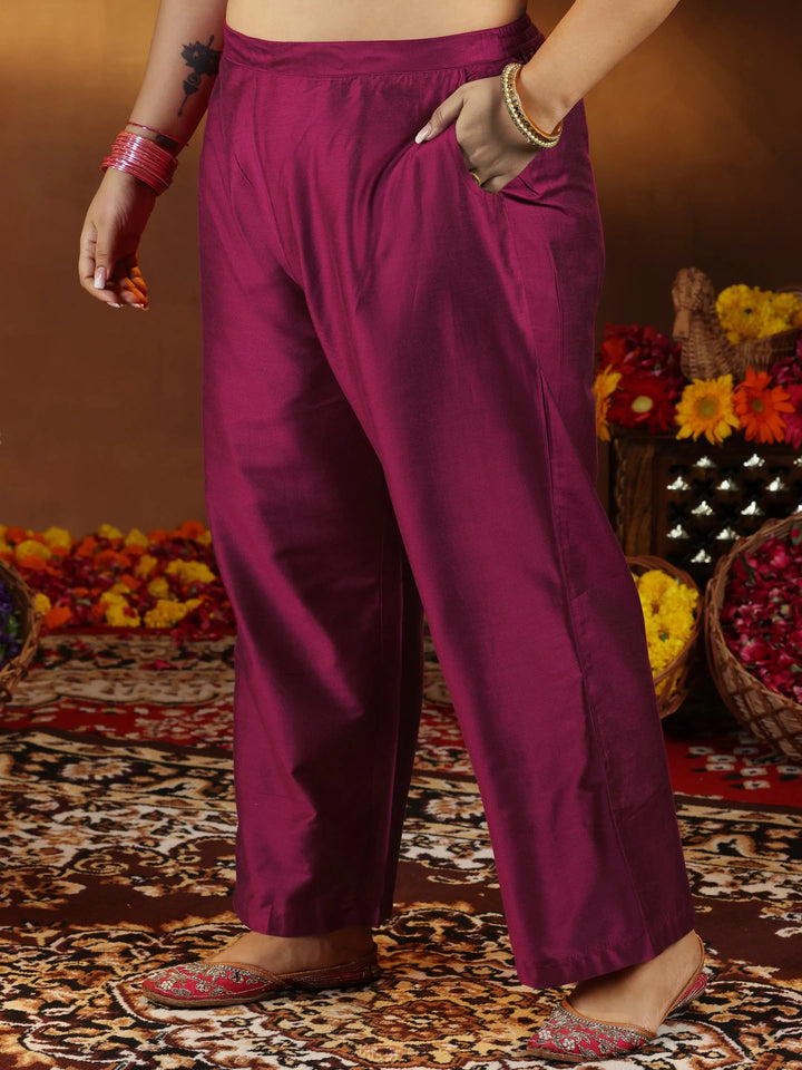 Libas Extra Love collection features our signature designs in comfortable plus sizes. Our 3-piece magenta silk blend kurta set features a straight-fit kurta with a round neckline, regular sleeves, and statement yoke. Complemented with straight pants with an elasticated waistband, and an embroidered dupatta. Adorned with embroidered accents, this style is perfect for dark festive occasions.