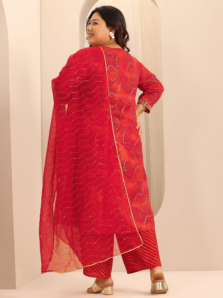 Plus Size Red Printed Silk Blend Straight Suit Set With Dupatta
