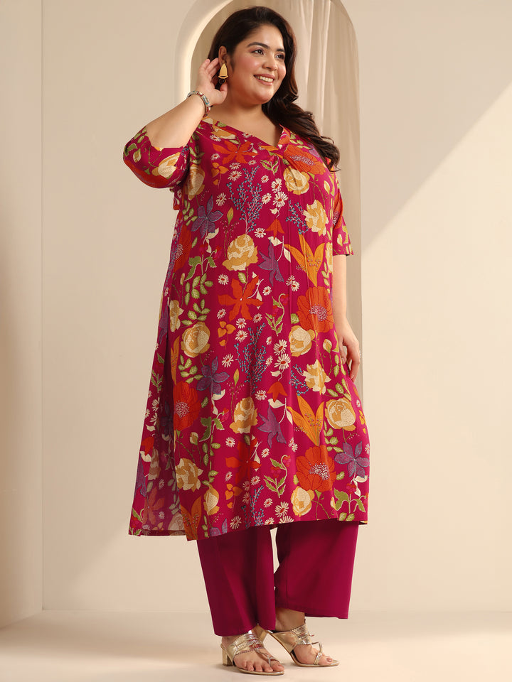 Our 2-piece red viscose straight-fit kurta set features a V-neckline, regular sleeves, and a statement yoke. Complemented with straight pants with a partially elasticated waistband and 2 pockets. Adorned with floral printed accents, this style is perfect for daily wear.