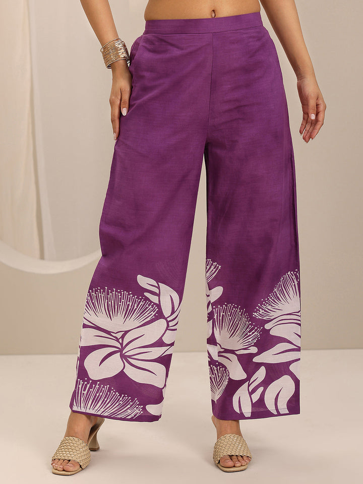 Our 2-piece Purple printed Cotton co-ord set features a Straight-fit Tunic with a Mandarin Collar neckline and Three-quarter sleeves. Complemented with matching Palazzos with an Elasticated waistband. Highlighted with Printed embellishments, this style is perfect for Casual wear.