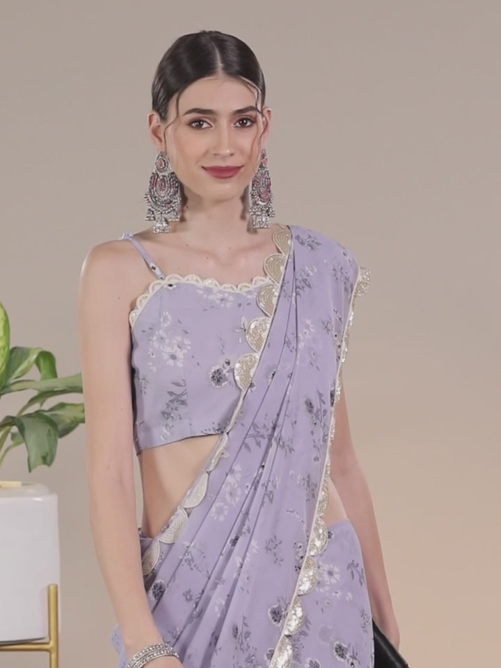 Our lavender and grey saree is crafted in pure georgette fabric highlighted by floral prints and embellished borders. Complemented with a stitched blouse, this graceful style is perfect for light festivities.