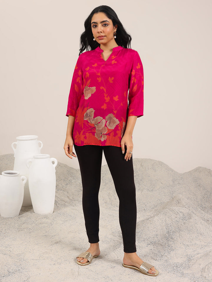 Our pink printed silk short kurti features a mandarin notched neckline and three-quarter sleeves. Highlighted with floral prints, this style is perfect for casual outings.