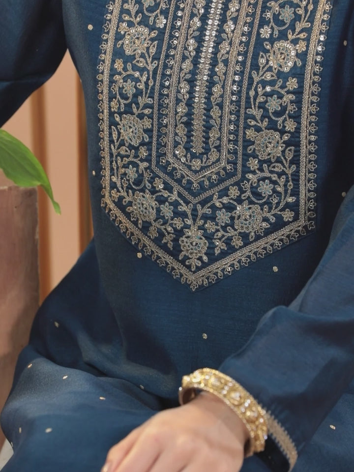 Our teal blue A-line silk kurta features ethnic motifs print, a round neckline, and long regular sleeves. Adorned with sequinned details, this graceful style is ideal for festive celebrations.