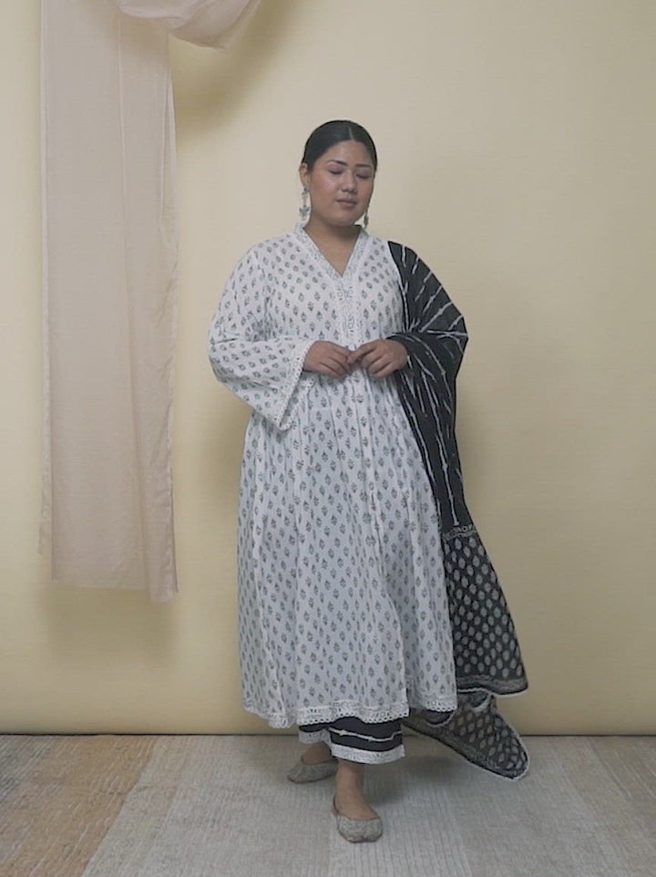 Plus Size Off-White Printed Cotton Anarkali Kurta With Palazzos & Dupatta