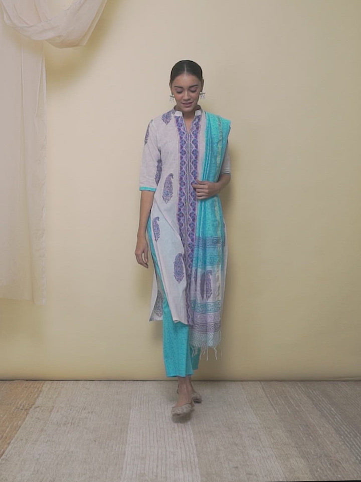 This 3-piece suit set includes our blue v-neck mandarin collar kurta,straight palazzo pants and dupatta. Accented with a vibrant yoke design and contrasting cuff details. Perfect for working from home.