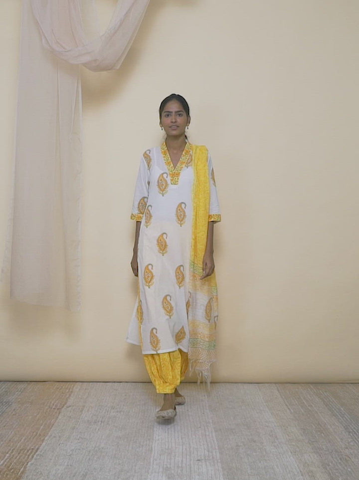 White Printed Cotton Straight Kurta With Salwar & Dupatta