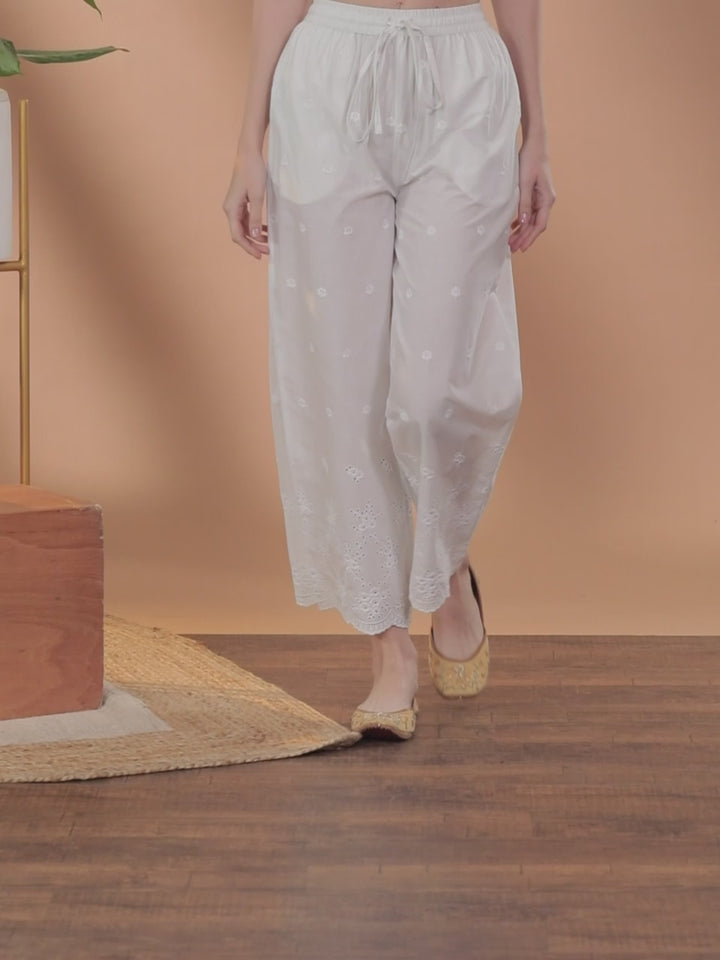 Our off-white woven palazzo pants feature a partially elasticated waistband, drawstring details and schiffli cutwork embroidery. Crafted in our cotton fabric and detailed with roomy pockets. Perfect for light festivities.
