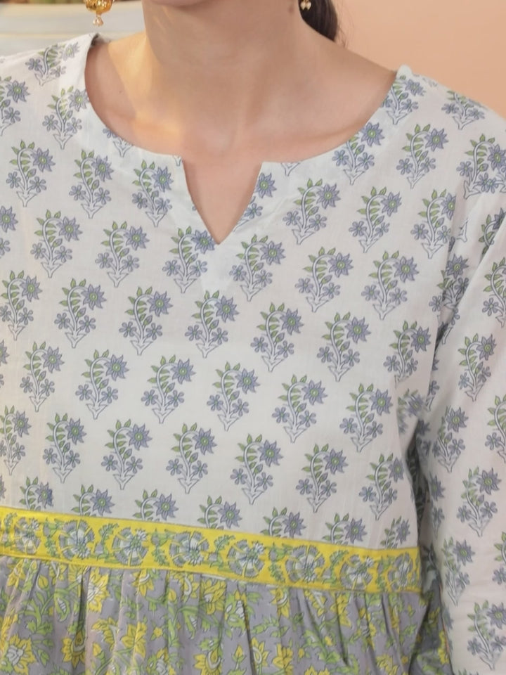 Our white A-line kurta cotton features floral motifs print, a notched neckline, three-quarter sleeves, and roomy pockets. This refreshing style is perfect for casual outings.