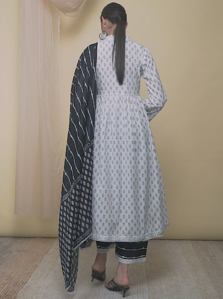 White Printed Cotton Anarkali Kurta With Palazzos & Dupatta