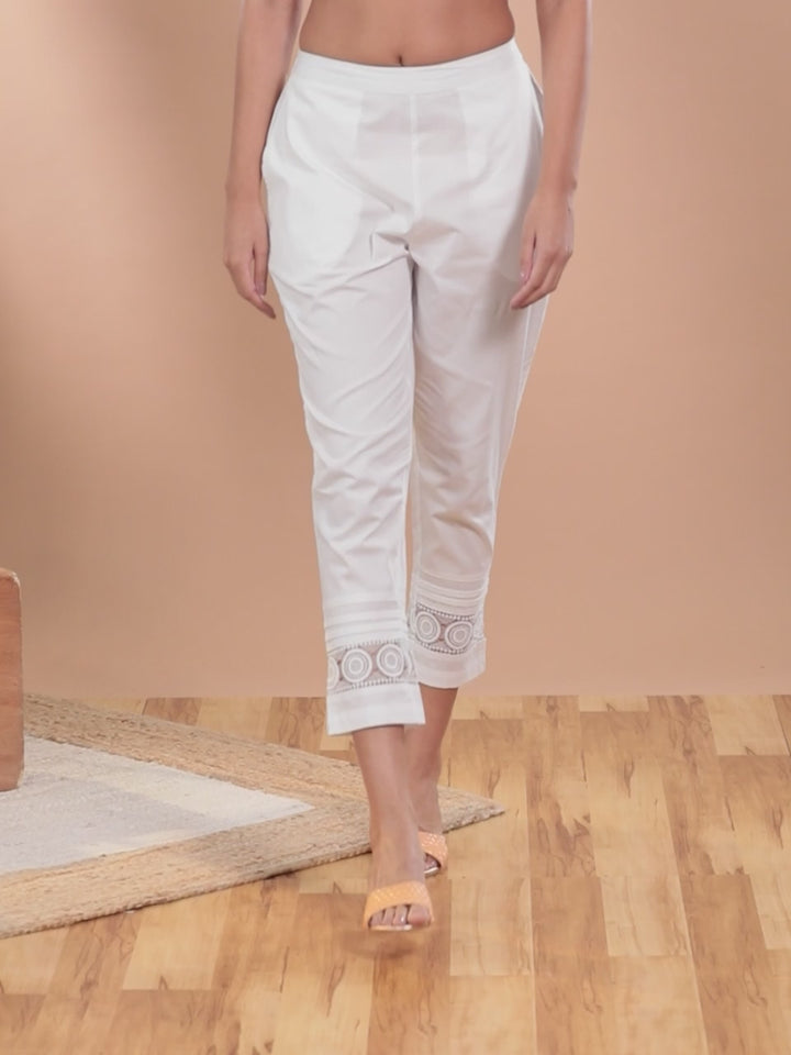 Our white cotton woven trousers feature a partially elasticated waistband, flat-front with no pleats design, and mid-rise waist style with button closure and roomy pockets. Adorned with an elegant hem design and fine embroidered lace edges, this intricate style is perfect for festive celebrations.