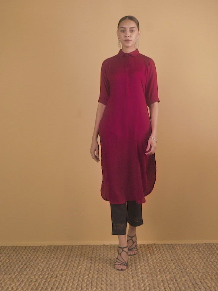 Our maroon collared kurta, crafted in rayon fabric, features half sleeves and curved hemline. Adorned with geometric woven design, this elegant style is perfect for work and beyond.