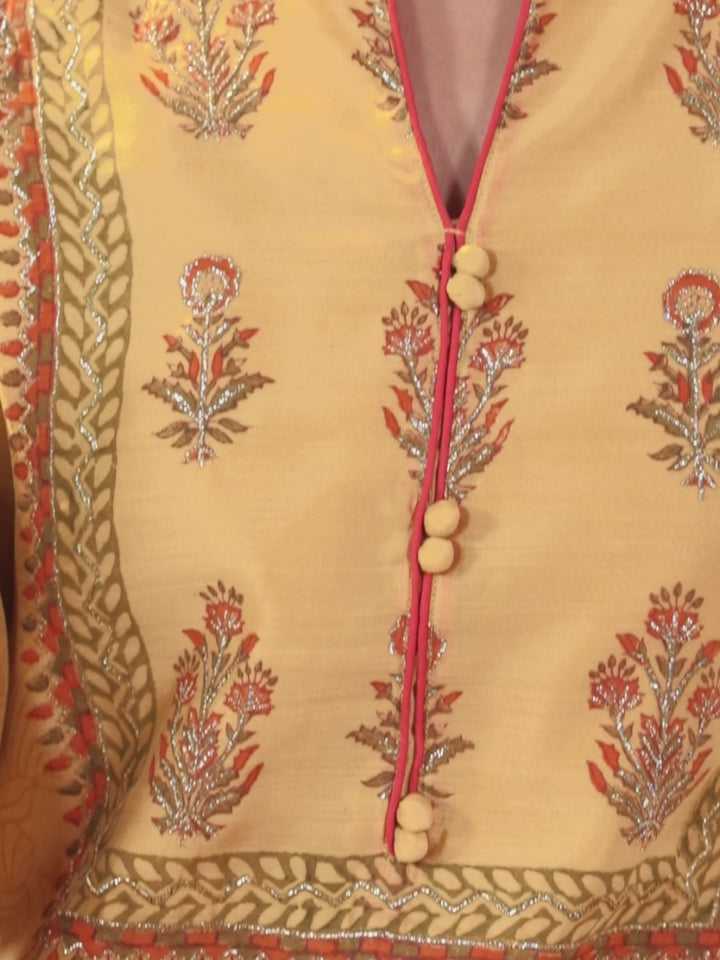 Yellow Printed Chanderi Silk Straight Kurta With Dupatta