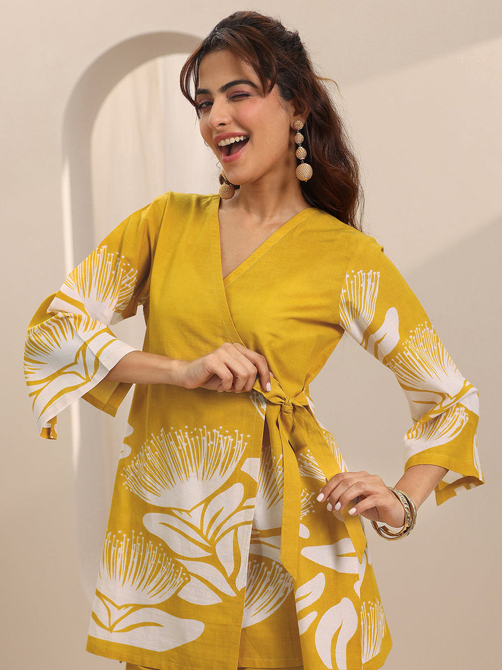 Our 2-piece Yellow printed Cotton co-ord set features a Straight-fit Tunic with a V-Neck neckline and Three-quarter sleeves. Complemented with matching Palazzos with a partially Elasticated waistband. Highlighted with Printed embellishments, this style is perfect for Casual wear.