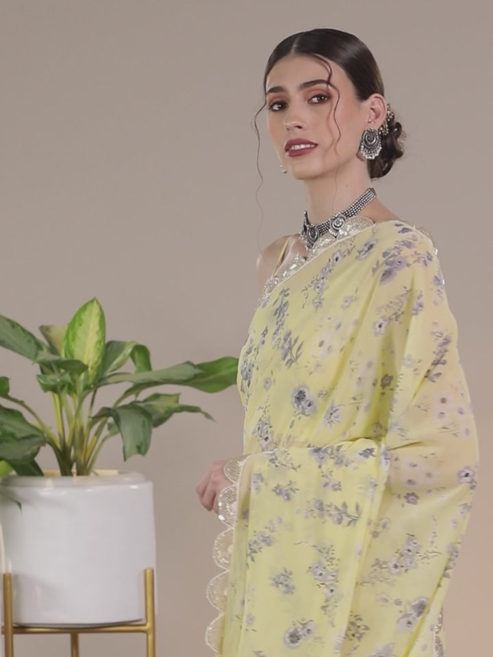 Our yellow saree is crafted in pure georgette fabric highlighted by floral prints and sequin borders. Complemented with a stitched blouse, this graceful style is perfect for light festivities.
