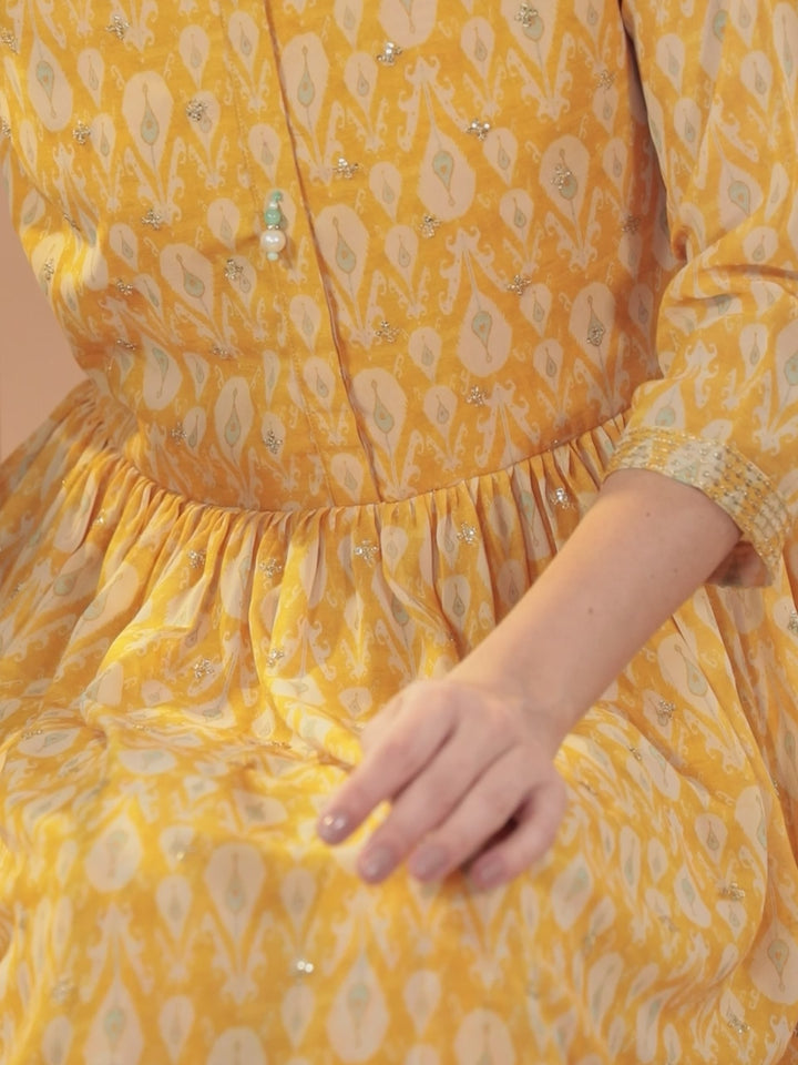 Our 3-piece yellow floral print georgette suit set features a short Anarkali kurti with a round neckline and three-quarter sleeves. Complemented with flowy sharara pants and a stylish dupatta with delicate fabric-trim and tassel detailing. Adorned with sequin detailing, this refreshing style is perfect for light festivities.