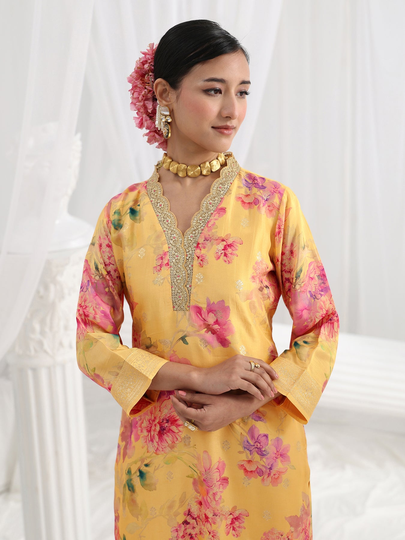 Our 3-piece yellow silk blend straight-fit kurta set features a V-neckline, regular sleeves, and statement yoke. Complemented with lining and straight pants with a partially elasticated waistband, and a floral dupatta. Adorned with floral printed, this style is perfect for festive occasions.