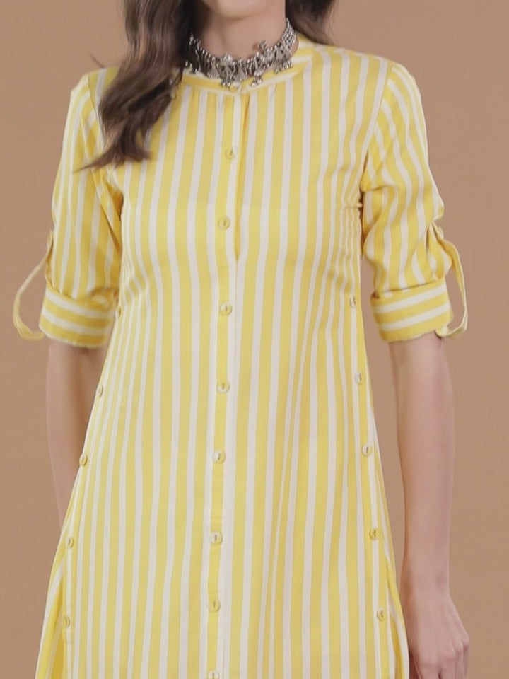 Our yellow and white midi A-line dress, crafted in soft rayon fabric, features a round neckline, striped print, three-quarter roll-up sleeves, a stylish front-slit and a flared hemline. This chic style ideal for casual outings.