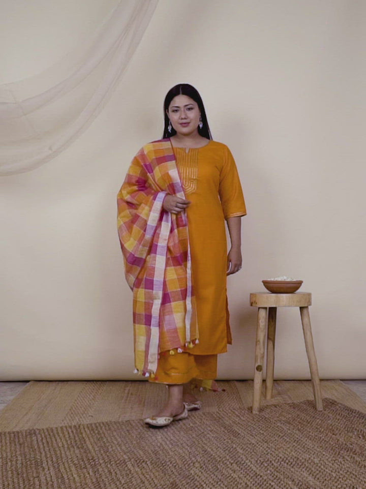 This 3-piece suit set includes our orange round neck straight kurta, straight palazzo pants and a matching dupatta. Crafted in cotton, featuring Gota trim details detailed with a striking yoke pattern in a notched neckline. Perfect for auspicious occasions.