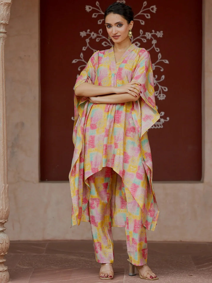 Our 2-piece yellow printed silk blend kurta set features an abstract print kaftan kurta with a V-neckline and three-quarter sleeves. Complemented with trousers with a partially elasticated waistband and roomy pockets. Elevated with pleated detailing and thread work, this style is perfect for casual outings.