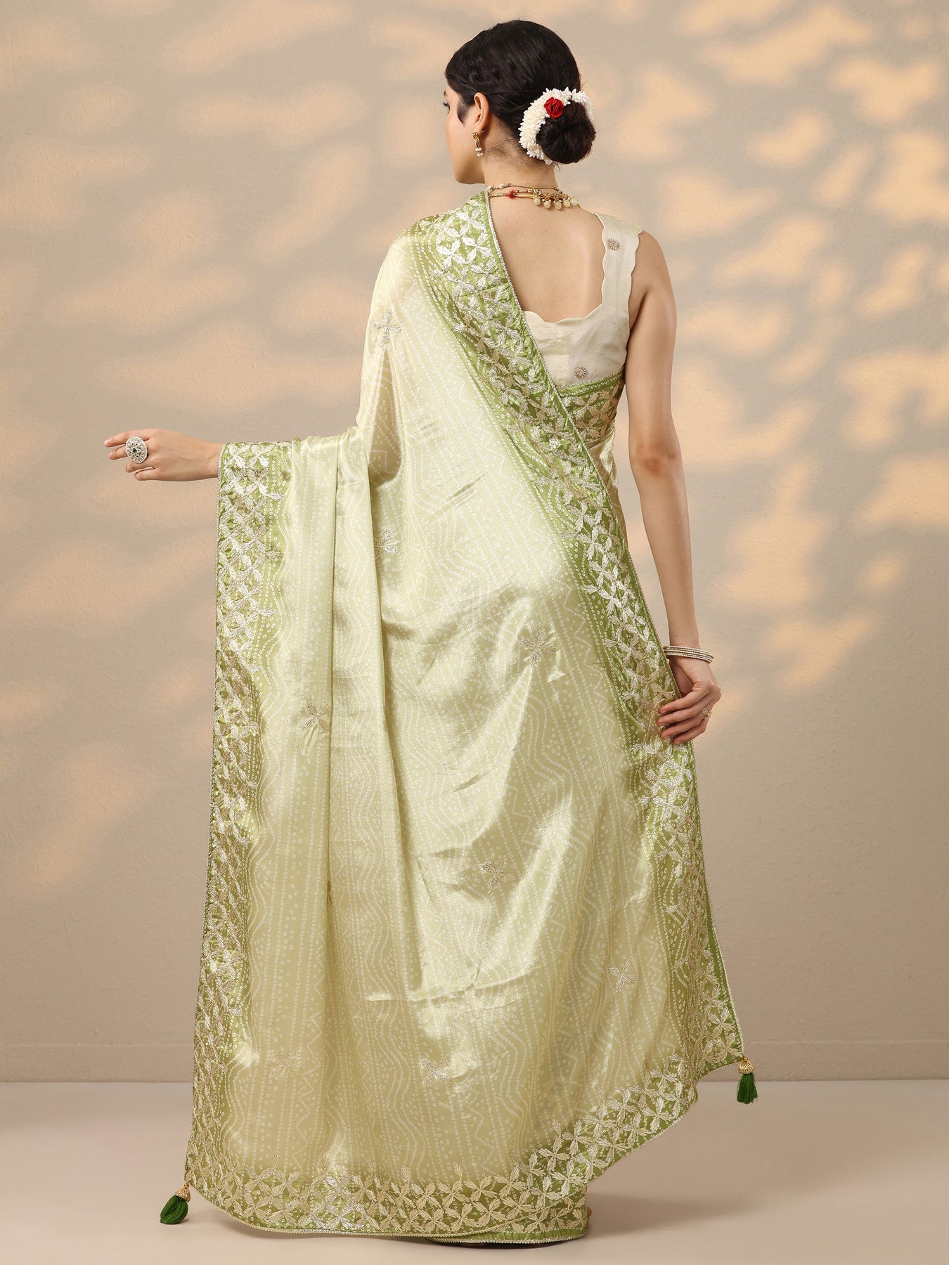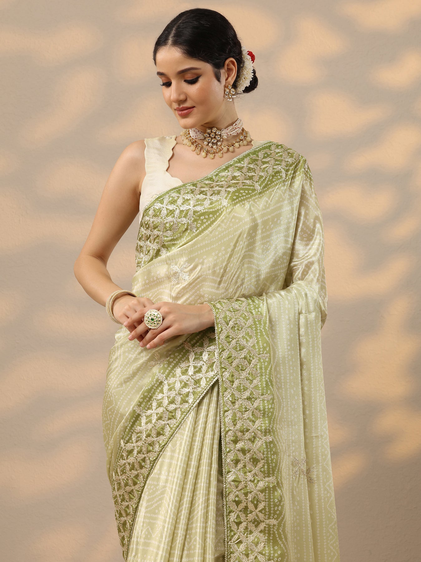Green Printed Banarasi Chinon Saree With Unstitched Blouse Piece
