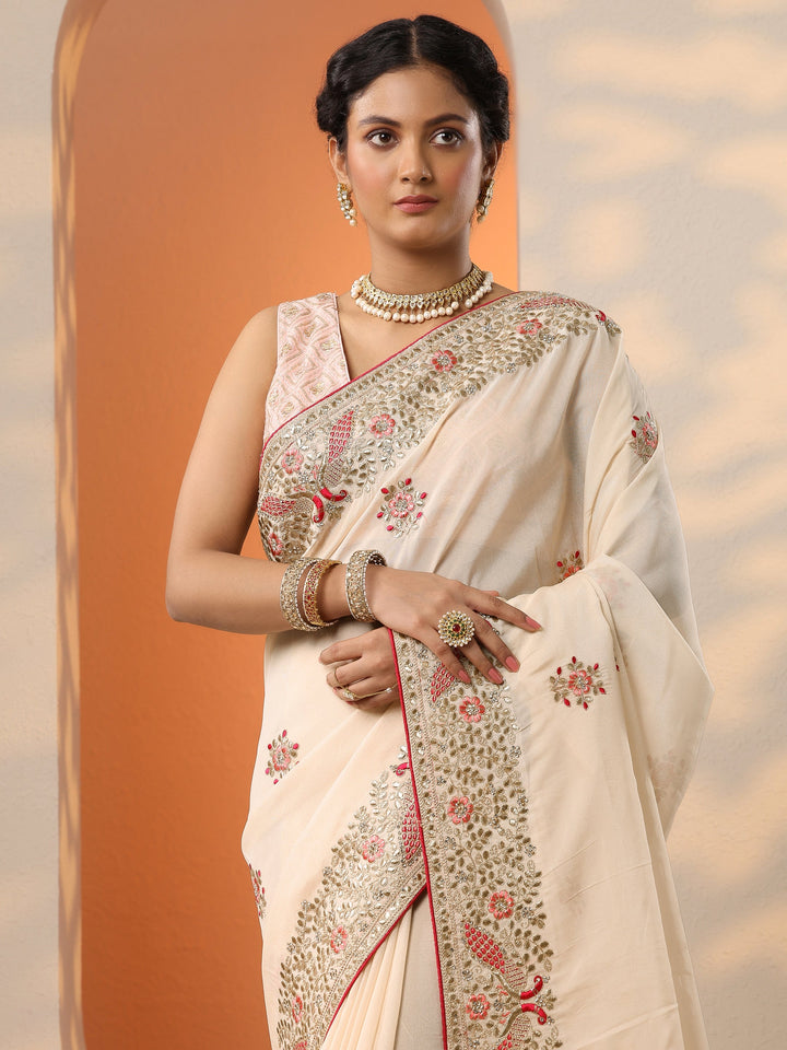 Off White Embroidered Silk Blend Saree With Unstitched Blouse Piece