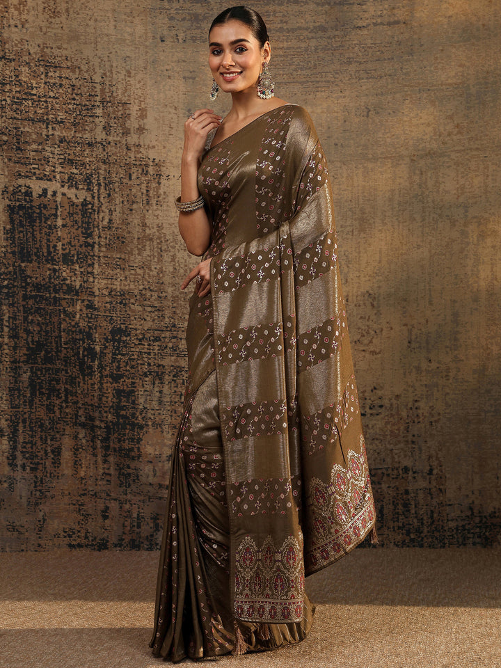 Our bronze printed silk blend saree features captivating NA print. Complemented with an unstitched Blouse Piece. This charming saree is perfect for festive occasions