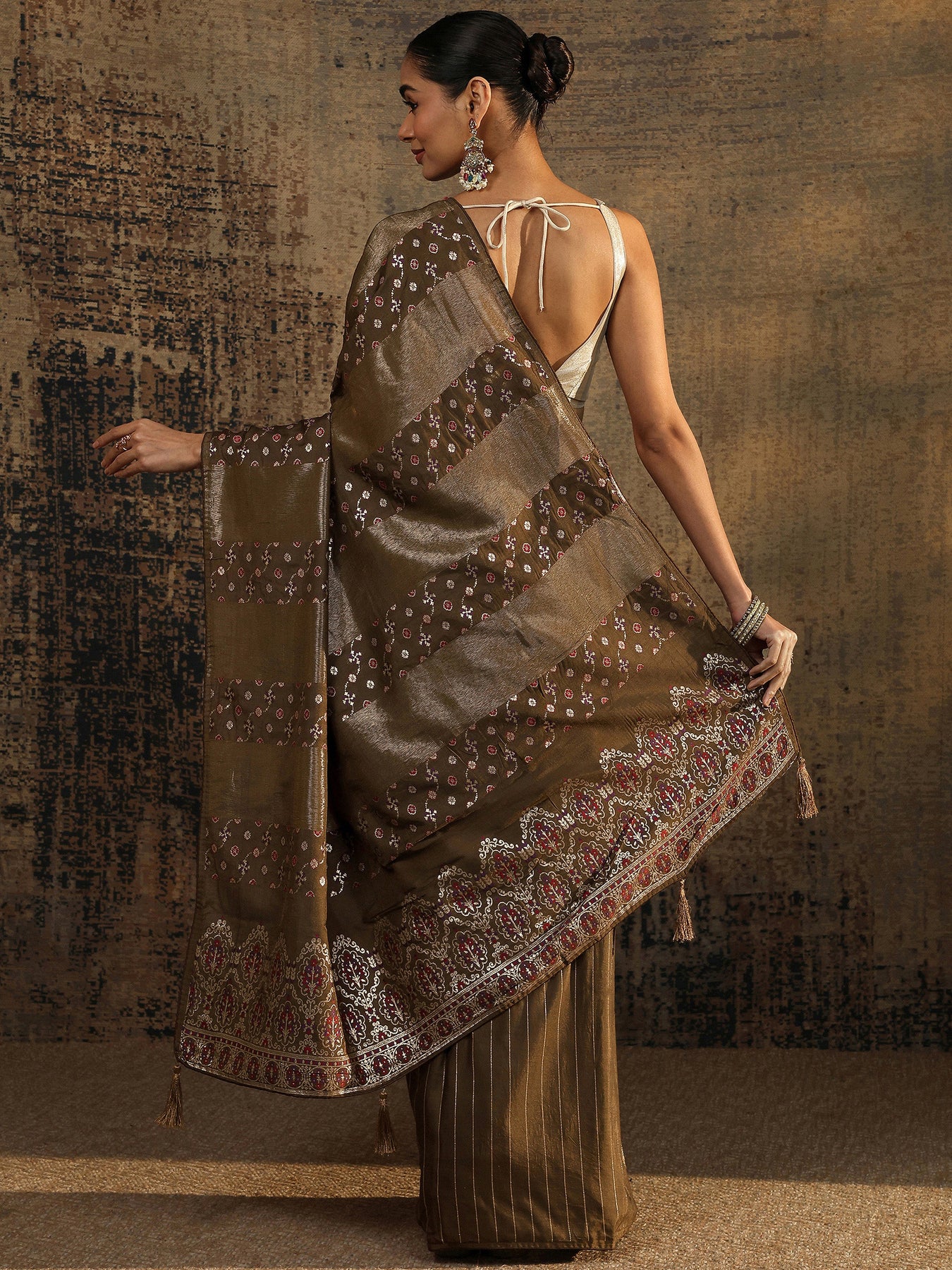 Bronze Woven Design Silk Blend Saree With Unstitched Blouse Piece