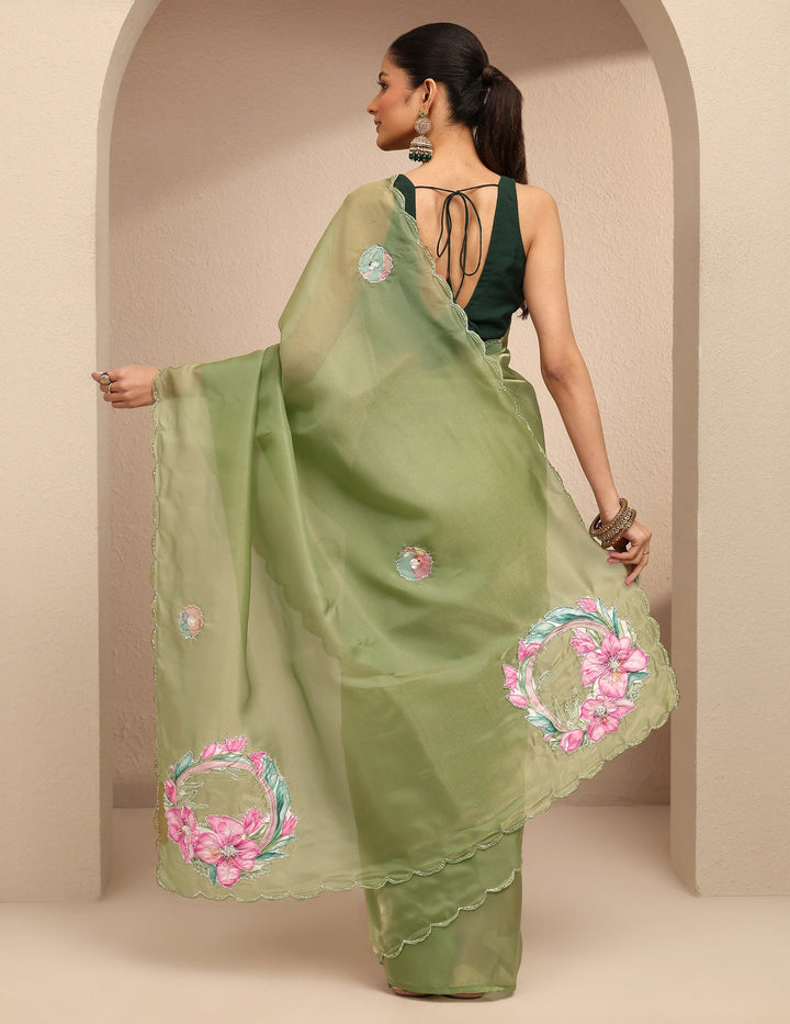 Green Embellished Silk Blend Saree With Unstitched Blouse Piece