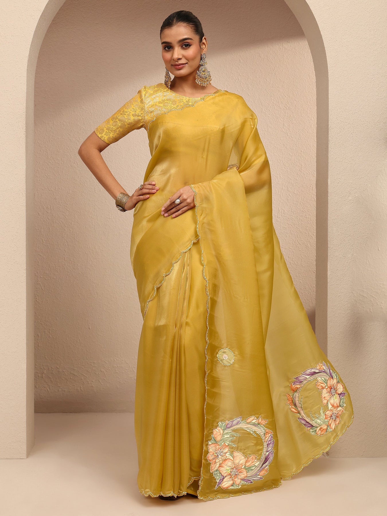 Our yellow silk blend saree features captivating floral print. Complemented with an unstitched blouse piece. This charming saree is perfect for festive occasions.