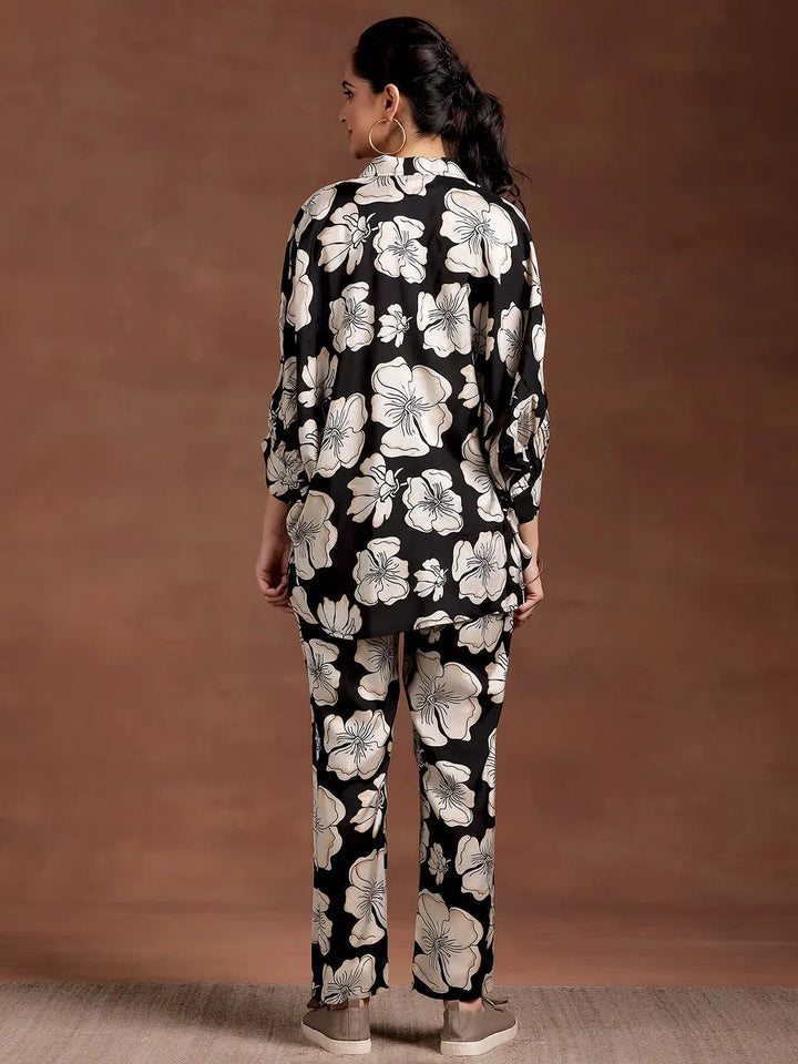 Our 3-piece black printed silk blend co-ord set features a buttoned-down tunic with shirt collar and three-quarter bat sleeves. Complemented with matching trousers with a partially elasticated waistband and roomy pockets. Elevated with captivating floral prints and stylish button accents, this style is perfect for casual outings.