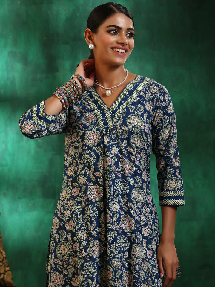 Our 2-piece blue printed cotton straight kurta set features a kurta with a V-neckline and three-quarter sleeves. Complemented with striped trousers with a fully elasticated waistband and roomy pockets. Highlighted with captivating floral prints and fabric-trim detailing, this style is perfect for elevated everyday wear.