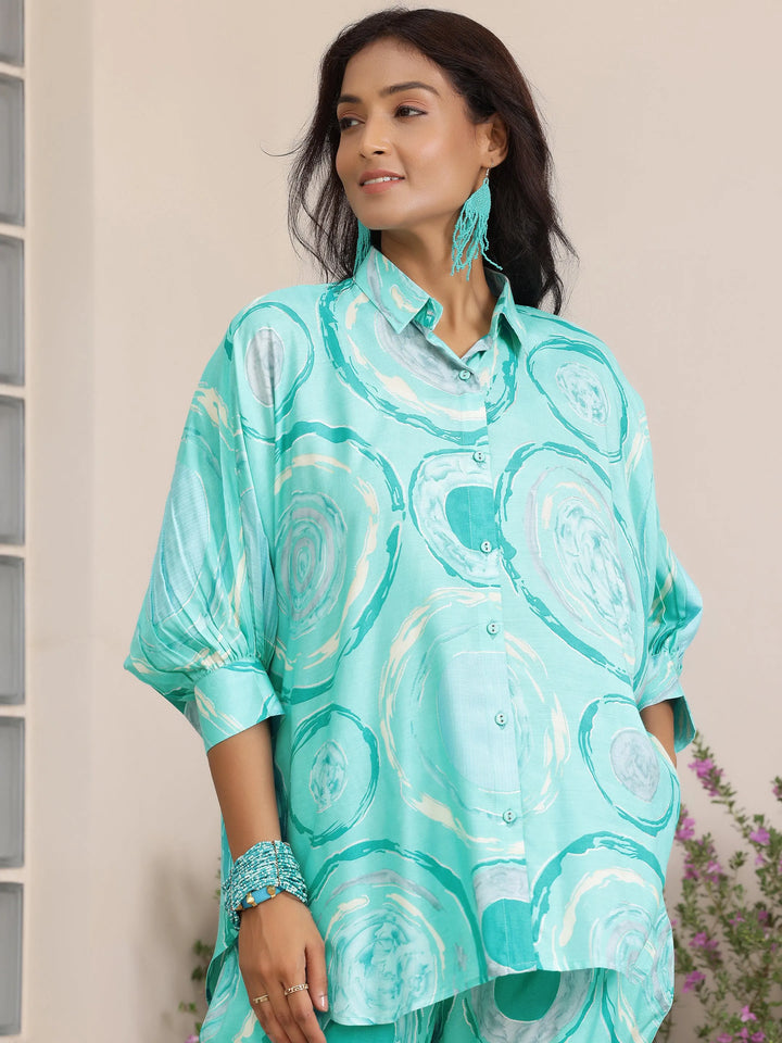 Our 2-piece blue printed silk blend co-ord set features an asymmetrical kurti with a shirt collar with buttoned-down detailing and three-quarter bishop sleeves. Complemented with matching trousers with a partially elasticated waistband and roomy pockets. Adorned with abstract geometric prints and stylish buttons, this style is perfect for casual outings.