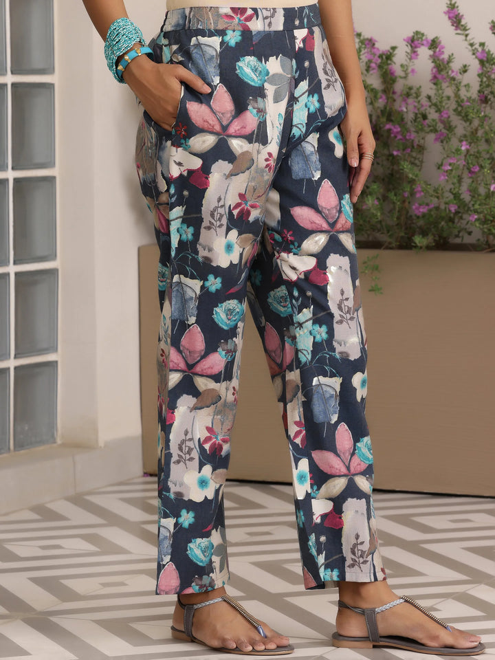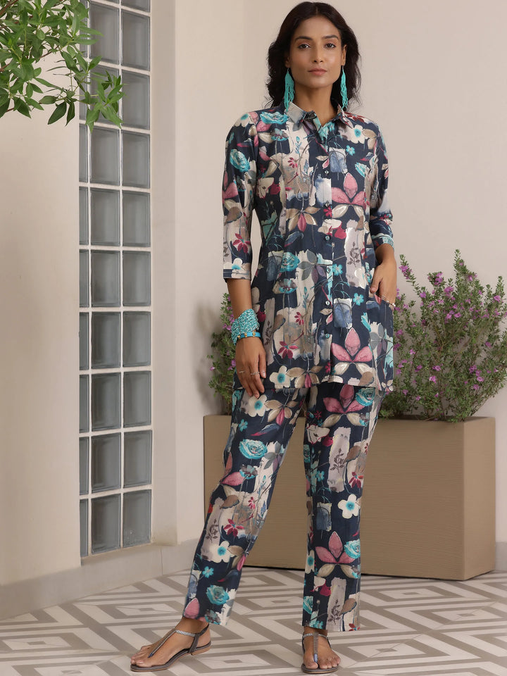 Our 2-piece blue printed silk blend co-ord set features a shirt collar tunic with buttoned-down detailing and three-quarter sleeves. Complemented with matching trousers with a partially elasticated waistband and roomy pockets. Highlighted with captivating floral prints and stylish buttons, this style is perfect for casual outings.