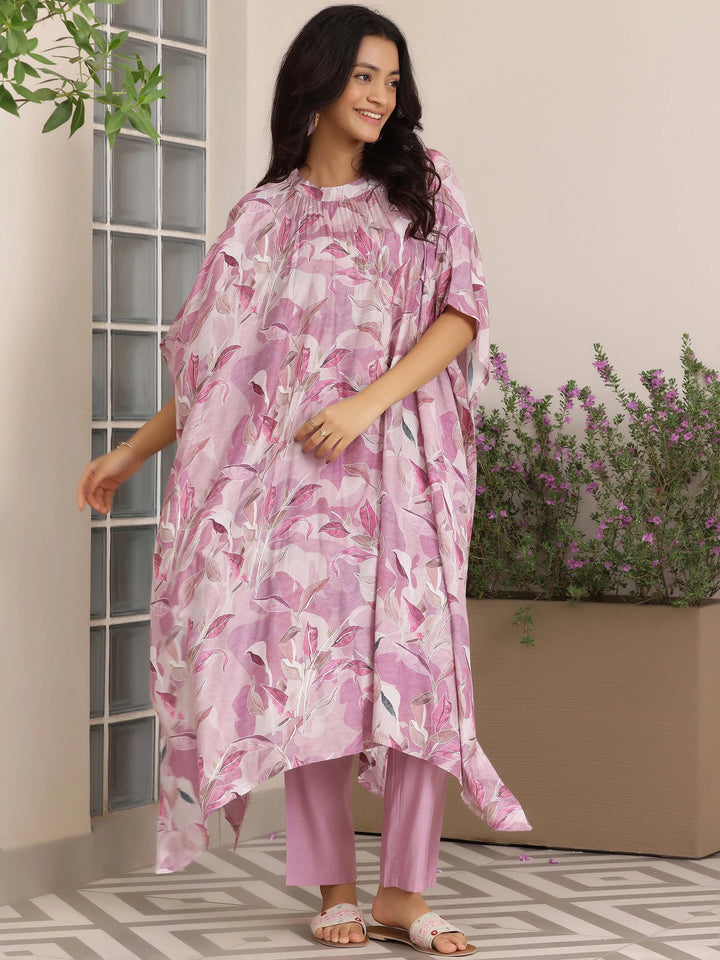 Our 2-piece lavender printed silk blend co-ord set features a kaftan kurta with a high collar and three-quarter kimono sleeves. Complemented with solid trousers with a partially elasticated waistband and roomy pockets. Adorned with captivating floral prints, this style is perfect for casual outings.