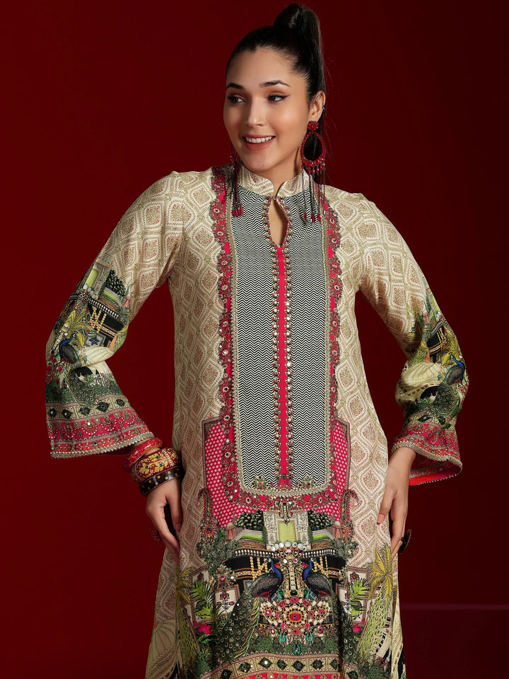 Our 2-piece multi printed muslin co-ord set features a straight-fit tunic with a mandarin collar and long sleeves. Complemented with matching dhoti pant with an elasticated waistband. Highlighted with printed, this style is perfect for festive.