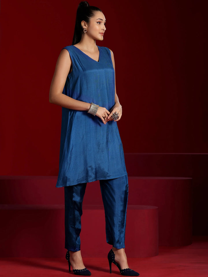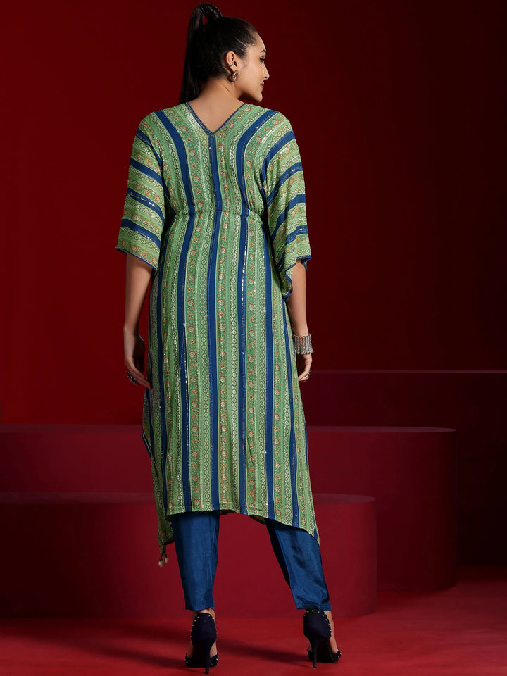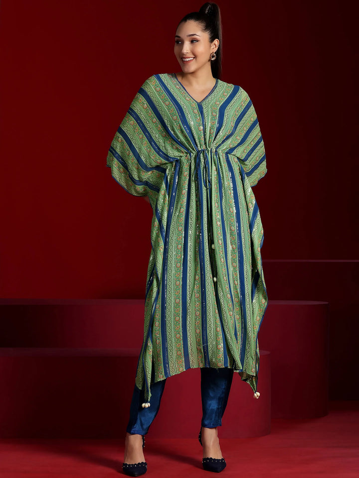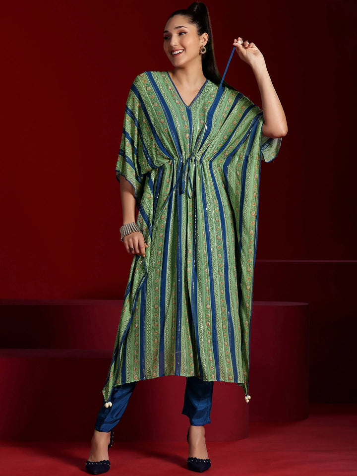 Our 2-piece Green printed Poly Georgette co-ord set features a Straight-fit Tunic with a V-Neck neckline and Short Sleeves. Complemented with matching Trousers with an Elasticated waistband. Highlighted with Printed, this style is perfect for Festive occasions.